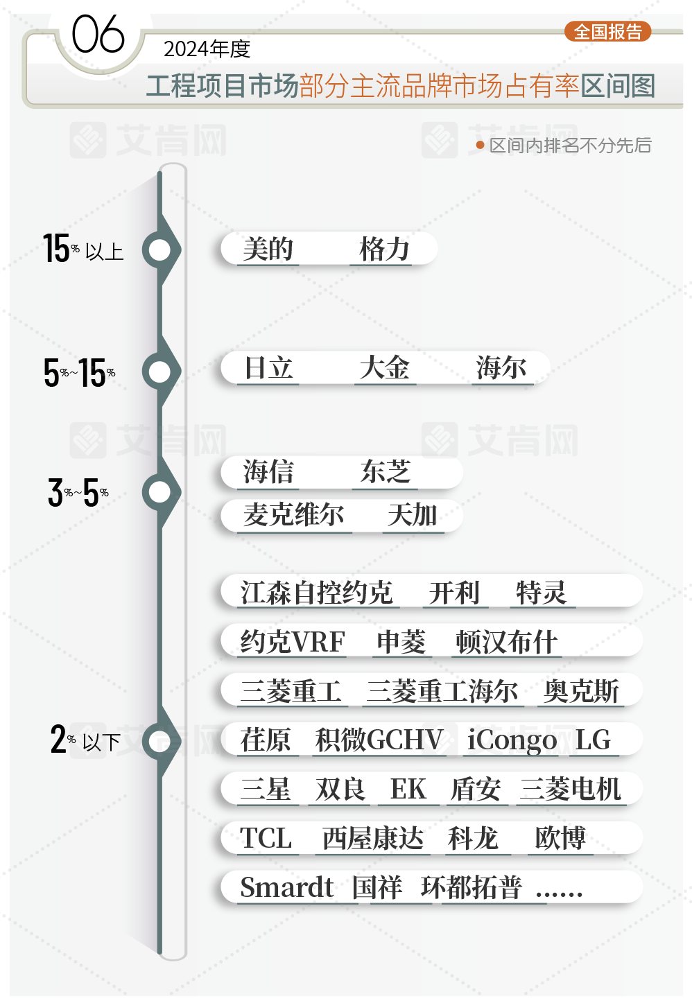 此外,江森自控約克、開利、特靈、約克VRF、申菱、頓漢布什、三菱重工、三菱重工海爾、奧克斯、荏原、積微GCHV、iCongo、LG、三星、雙良、EK、盾安、TCL、西屋康達、科龍、歐博、SMARDT、國祥、環都拓普等品牌也在2024年度的工程項目市場中取得了不錯的占有率,它們依靠自身特色的產品在工程項目市場或者是部分細分市場取得了一定的成績。
