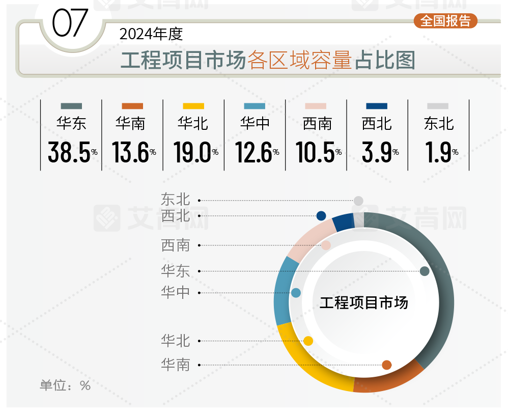 區域層面,工程項目市場的區域份額分布與全國整體市場的區域份額分布大致相同。其中,華東區域憑借其經濟發達、基礎設施完善及市場需求眾多占有率最大,達到38.5%,但是與2023年同期相比占有率有所下降,顯示其受整體環境影響更大。華北區域以19.0%的占有率排名第二,是工程項目市場除華東區域以外最為重要的市場,2024年在城市改造更新方面釋放出不少的項目,同比2023年度在占有率方面也有所提升。華南區域位列第三,其占有率達到13.6%,但受制于精裝修樓盤配套市場的下滑其整體占有率同比2023年度也有所降低。華中區域以12.6%的占有率同比2023年度也有所提升,相比其它市場,華中區域的幾個省份在近幾年都保持了較好的增長潛力。西南、西北和東北三個區域在工程項目市場的占有率分別為10.5%、3.9%和1.9%,與2023年度相比變化并不明顯。