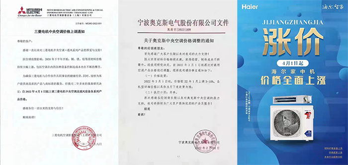 時間走到2022年,銅等原材料價格不僅沒有下跌的勢頭,反而又開始了一輪又一輪上漲。暖通企業的經營成本壓力可想而知,也因此,在2022年一季度,包括江森自控約克品牌、美的、海爾、東芝空調、大金、TCL暖通、三菱電機、奧克斯、格蘭富等不少企業對外發布了新的調價通知。而調價的理由無一例外的都提到了原材料價格上漲。
