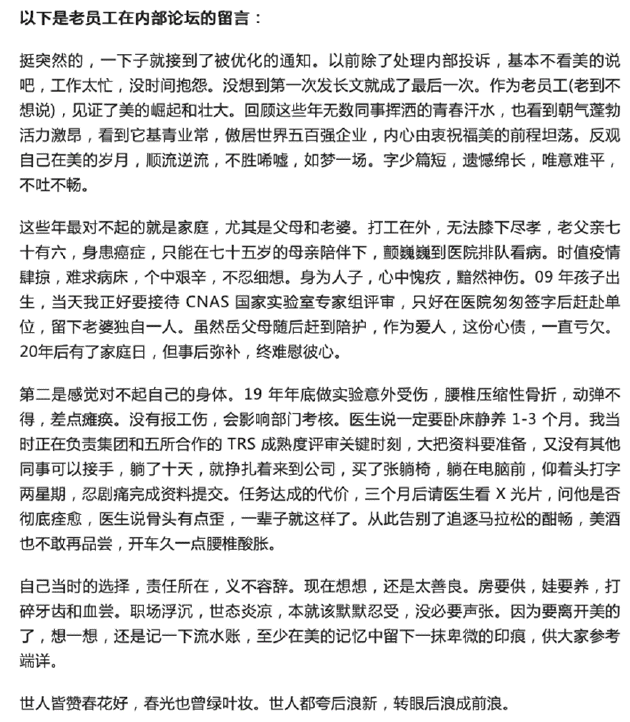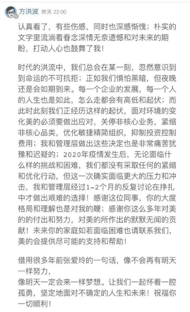 更值得深思的是,一位被裁員工的內部感言也引起業界關注與眾人感傷。對此,美的集團董事長兼總裁方洪波發文回應稱:有些傷感,同時也深感慚愧,是掙扎中做出的艱難選擇。