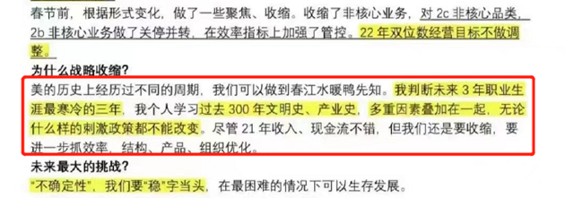 針對網傳脈脈裁員一事,美的集團于近期回應稱,“鑒于對內外部環境的判斷,公司有序收縮非核心業務,暫緩非經營性投資”。而在此之前,5月初的一場美的集團管理層交流會中,美的集團董事長兼總裁方洪波在講解公司2022年戰略規劃之時,悲觀地直言道:“未來三年將會面臨比較大的困難,是前所未有的寒冬。”