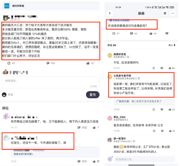 業務調整之下,裁員是副產品。在脈脈等社交媒體上,已經出現關于美的裁員的爆料。爆料信息顯示,美的新業務100%被裁或要求轉崗,母嬰、寵物等其他部門均有10%左右裁員。另有美的廚衛事業部員工爆料,“目前部門研發部門10%的裁員指標已經定下,第二輪的裁員也已經開始。”