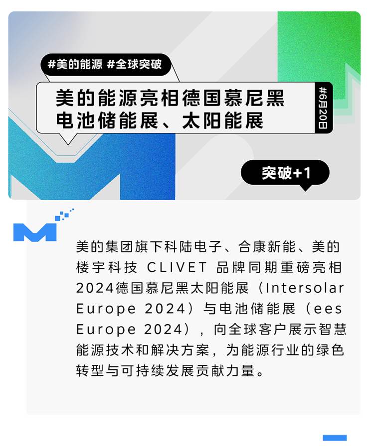 2024年6月19日-21日,美的集團旗下科陸電子、合康新能、美的樓宇科技 CLIVET 品牌同期重磅亮相2024德國慕尼黑太陽能展(Intersolar Europe 2024)與電池儲能展(ees Europe 2024),美的能源業務板塊向全球客戶展示智慧能源技術和解決方案,為能源行業的綠色轉型與可持續發展貢獻力量。