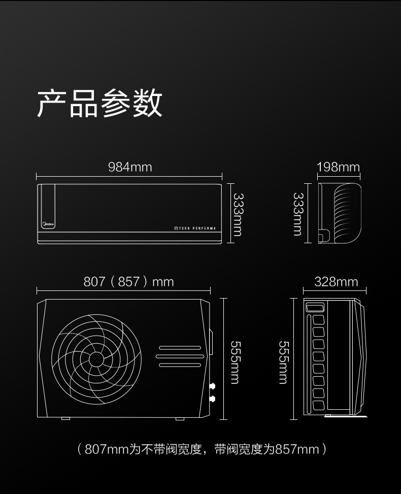室外機(jī)外形尺寸(寬/含閥體)(單位:mm) 857